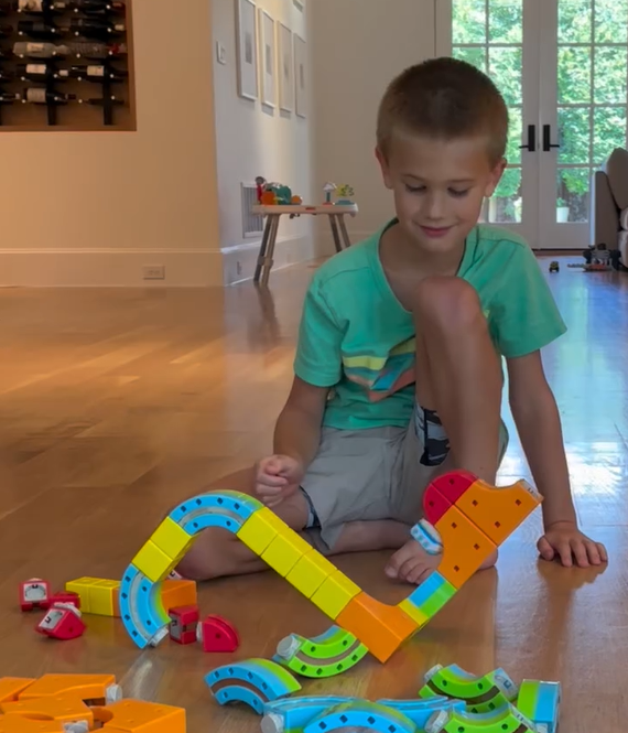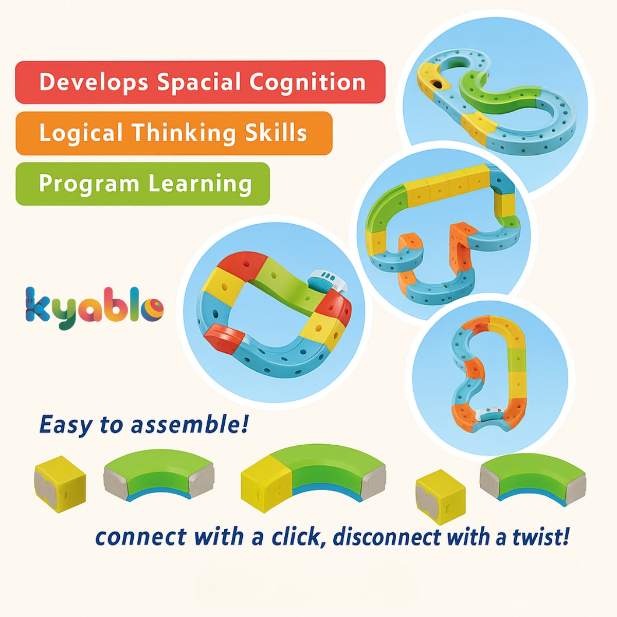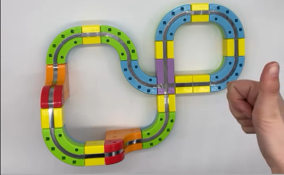 Super easy! Each piece clicks together with a magnet and twists apart. Even younger kids can build simple layouts on their own, and older kids can create more advanced tracks.